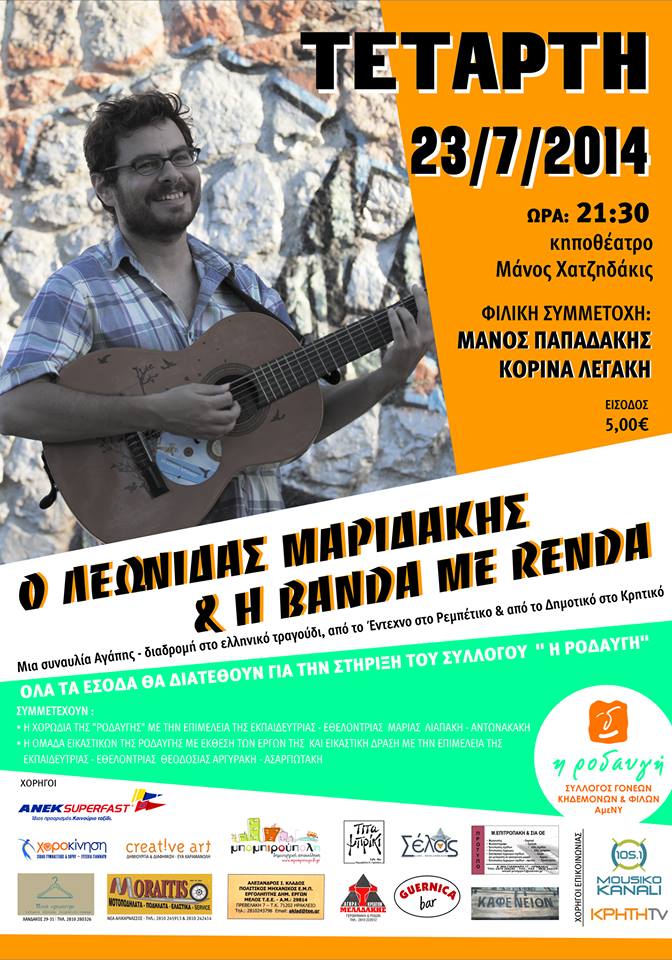 Ο Λεωνίδας Μαριδάκης και η μπάντα Me Renda με τη φιλική συμμετοχή του τραγουδοποιού Μάνου Παπαδάκη και της τραγουδίστριας Κορίνας Λεγάκη, τραγουδούν για το Σύλλογο γονέων – κηδεμόνων και φίλων Ατόμων με Νοητική Υστέρηση ΄΄Η ΡΟΔΑΥΓΗ΄΄, την Τετάρτη 23 Ιουλίου, στο κηποθέατρο Μάνος Χατζηδάκης, 9:30 μμ.