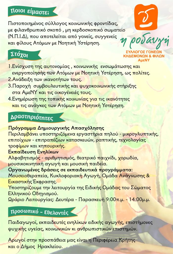 Πρόκειται για ένα μη κερδοσκοπικό σωματείο (Ν.Π.Ι.Δ.). Αποτελείται από γονείς, συγγενείς και φίλους Ατόμων με Νοητική Υστέρηση. Ο σύλλογος μας είναι πιστοποιημένος από το Εθνικό Κέντρο Κοινωνικής Αλληλεγγύης και εγγεγραμμένος στο Μητρώο Φορέων Παροχής Κοινωνικής Φροντίδας της Περιφερειακής ενότητας Ηρακλείου, στο Εθνικό Μητρώο Φορέων Ιδιωτικού Τομέα Μη Κερδοσκοπικού Χαρακτήρα και στο Ειδικό Μητρώο Εθελοντικών Μη Κυβερνητικών Οργανώσεων.